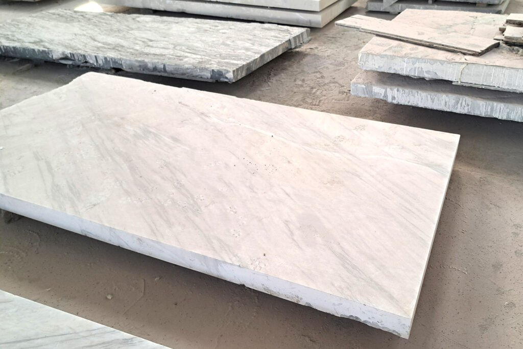 - Előkészítés: A márvány alapanyag hatalmas, több tonnás tömbökben érkezik az üzem területére, ahol első lépésként körülbelül 30 cm-es táblákra vágják fel.